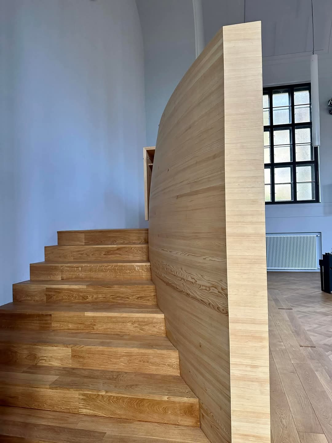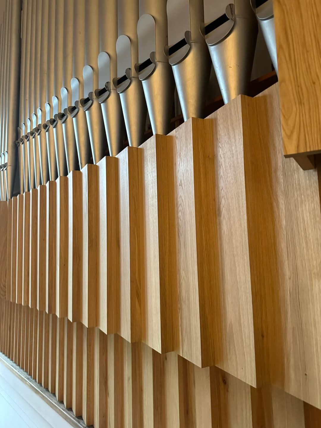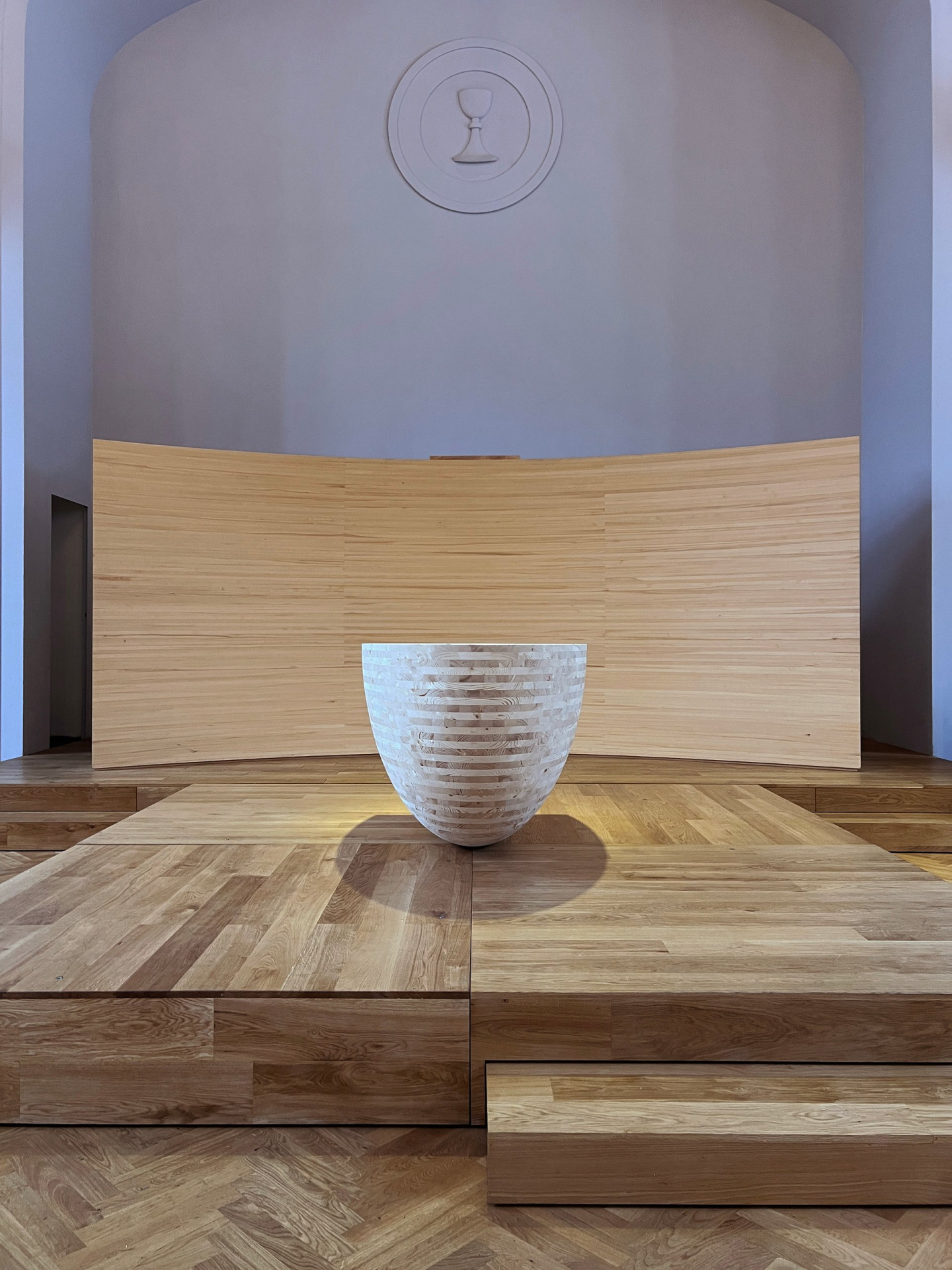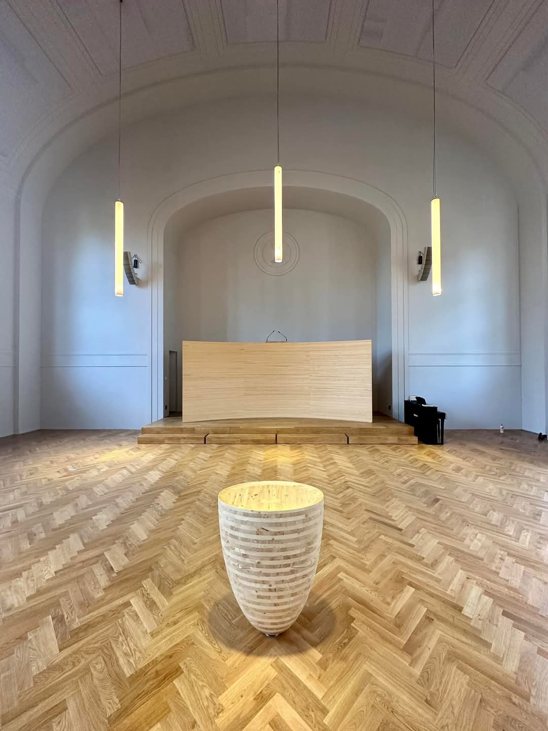V rámci projektových požadavků jsme také vyrobili křtitelnici ze smrkového dřeva a oltář a presbytář do tvaru paraboly, který se stal výrazným architektonickým prvkem v interiéru. V neposlední řadě jsme se podíleli na obložení původních varhan, čímž jsme zvýraznili jejich historickou hodnotu a estetiku.