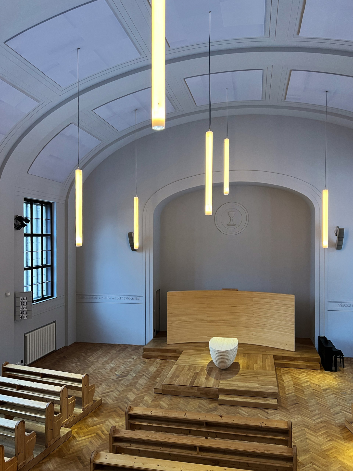 V rámci projektu pro Evangelický kostel – Sborový dům J. A. Komenského jsme realizovali specifické vybavení kostela dle zadání renomovaného architekta prof. Ing. arch. Miroslava Cikána. Naším úkolem bylo zachovat historický charakter budovy, zároveň však zlepšit její funkčnost a estetiku.