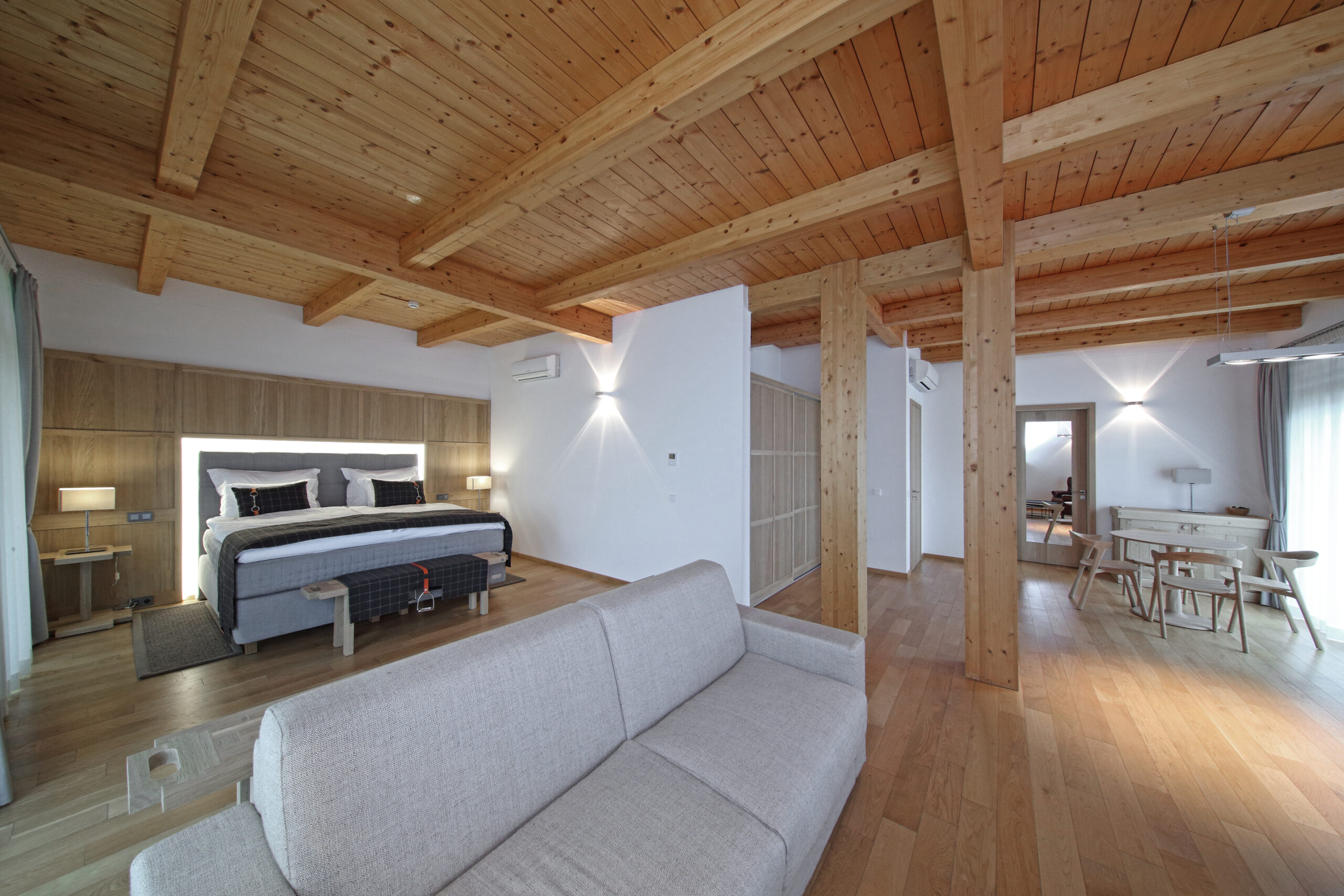 Restaurace byla vybavena masivními dubovými stoly, židlemi, lavicemi a policemi, které zajišťují nejen estetickou hodnotu, ale také dlouhou životnost a odolnost vůči provozní zátěži. Hotelové pokoje jsme vybavili postelemi, šatními skříněmi, komodami, nočními stolky a lavicemi, přičemž kombinace masivního dubu s koženými doplňky dodává interiéru luxusní a útulný charakter. Povrchová úprava jednotlivých prvků byla provedena dle přesných požadavků, aby splňovala jak estetické, tak funkční nároky provozu.