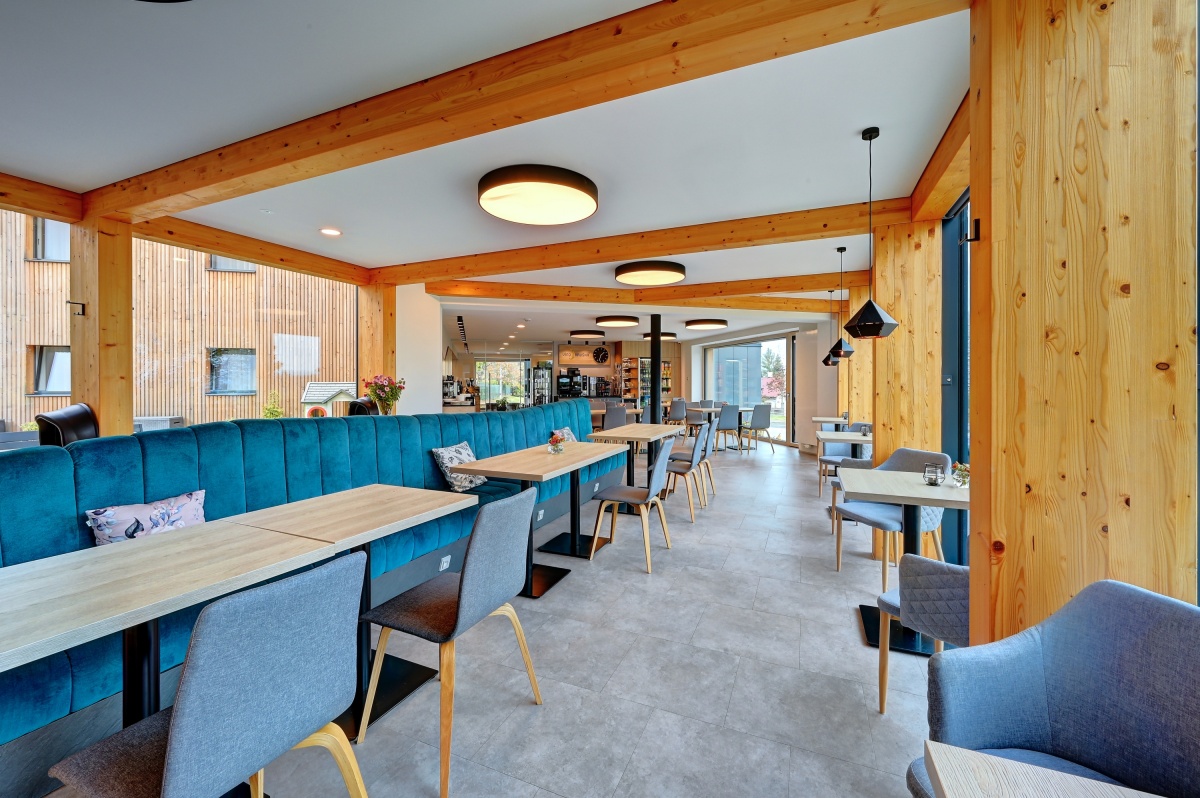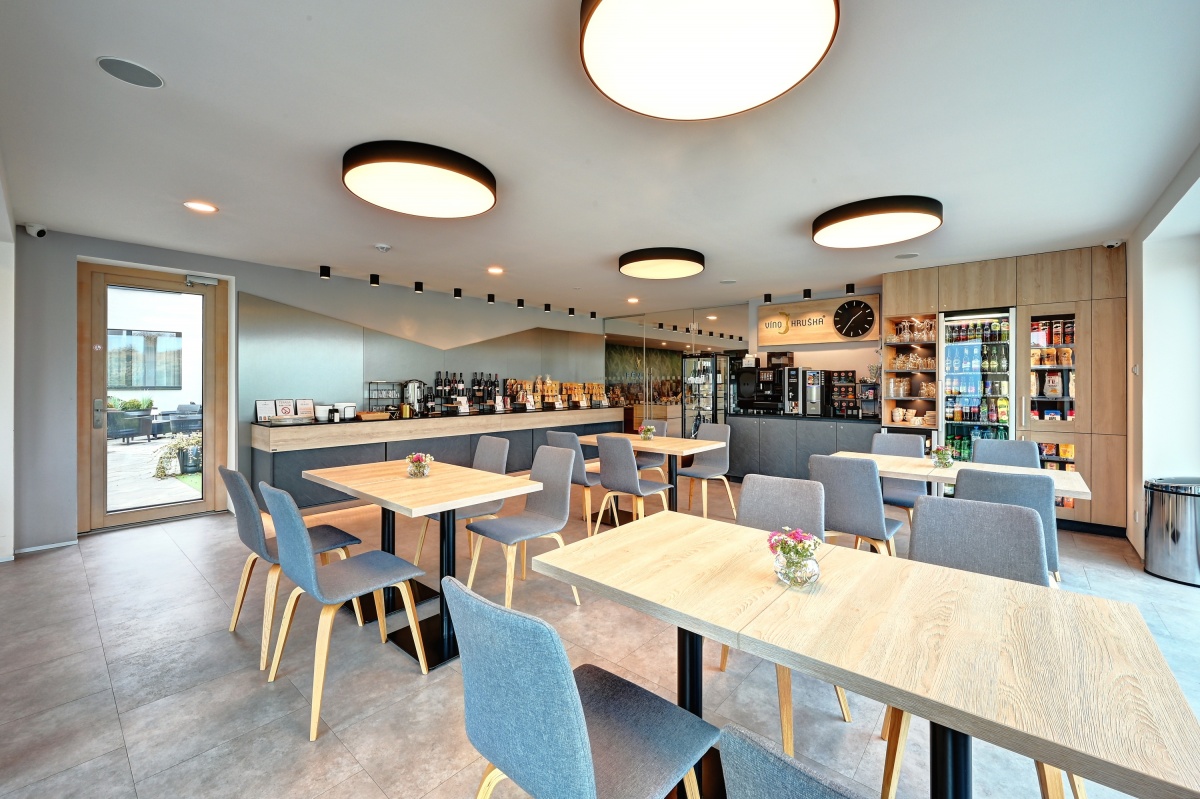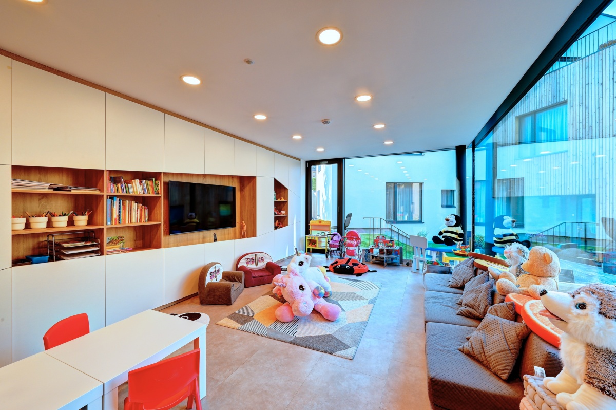 Recepce byla navržena jako reprezentativní vstupní prostor s důrazem na čisté linie a přívětivou estetiku. Dětská herna byla vybavena tak, aby nabízela bezpečné a hravé prostředí pro nejmenší návštěvníky. Jídelní místnost jsme doplnili o funkční nábytkové prvky, které podporují pohodlí při stolování a zároveň podtrhují styl celého interiéru.