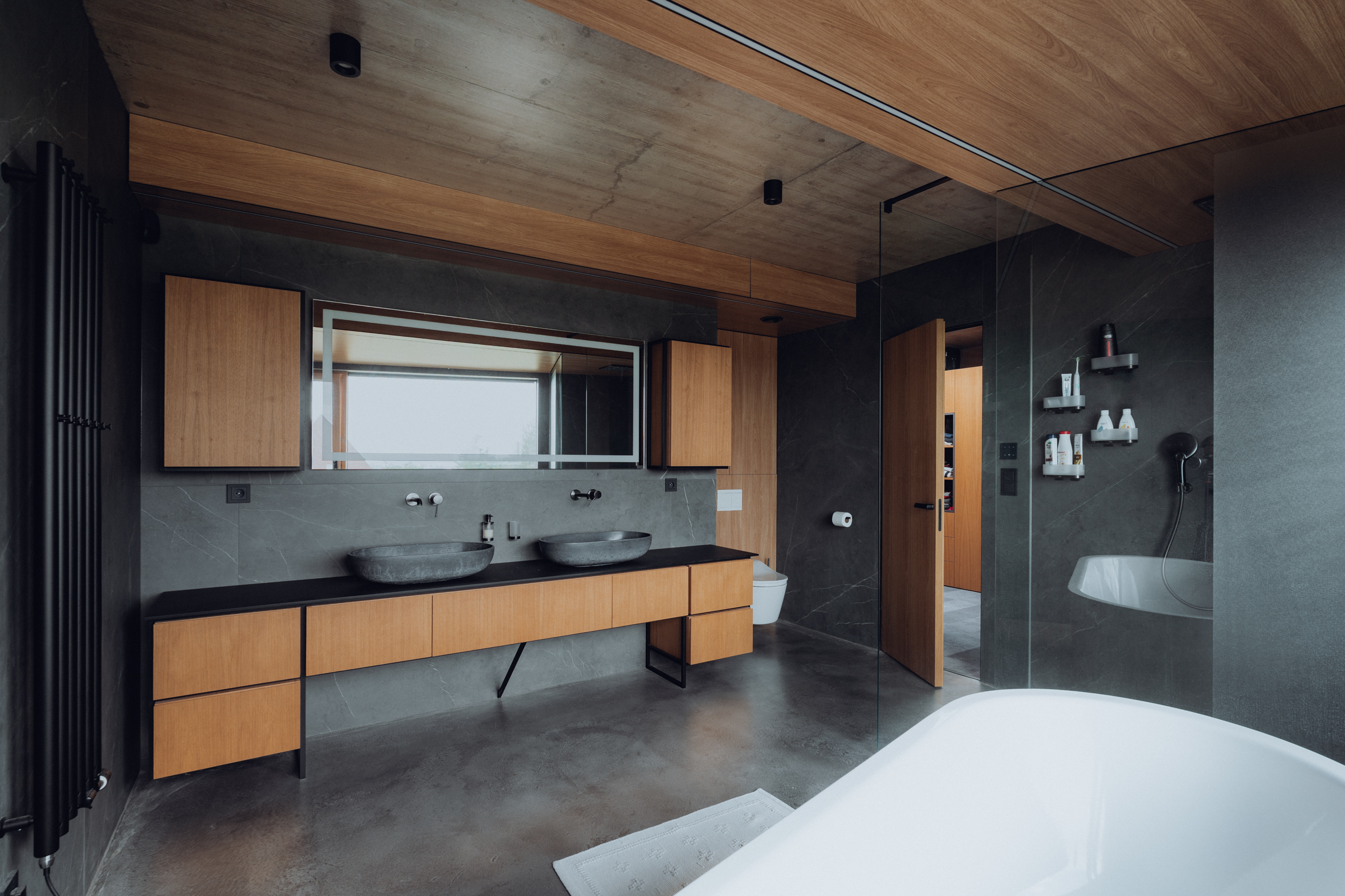 Netradičním prvkem realizace bylo řešení atypické hlavní koupelny, kde jsme pracovali s kovovými konstrukcemi na míru a kompaktními deskami pro obklady stropů, díky čemuž vznikl harmonický celek se specifickou atmosférou vycházející z kombinace surovosti a elegance.