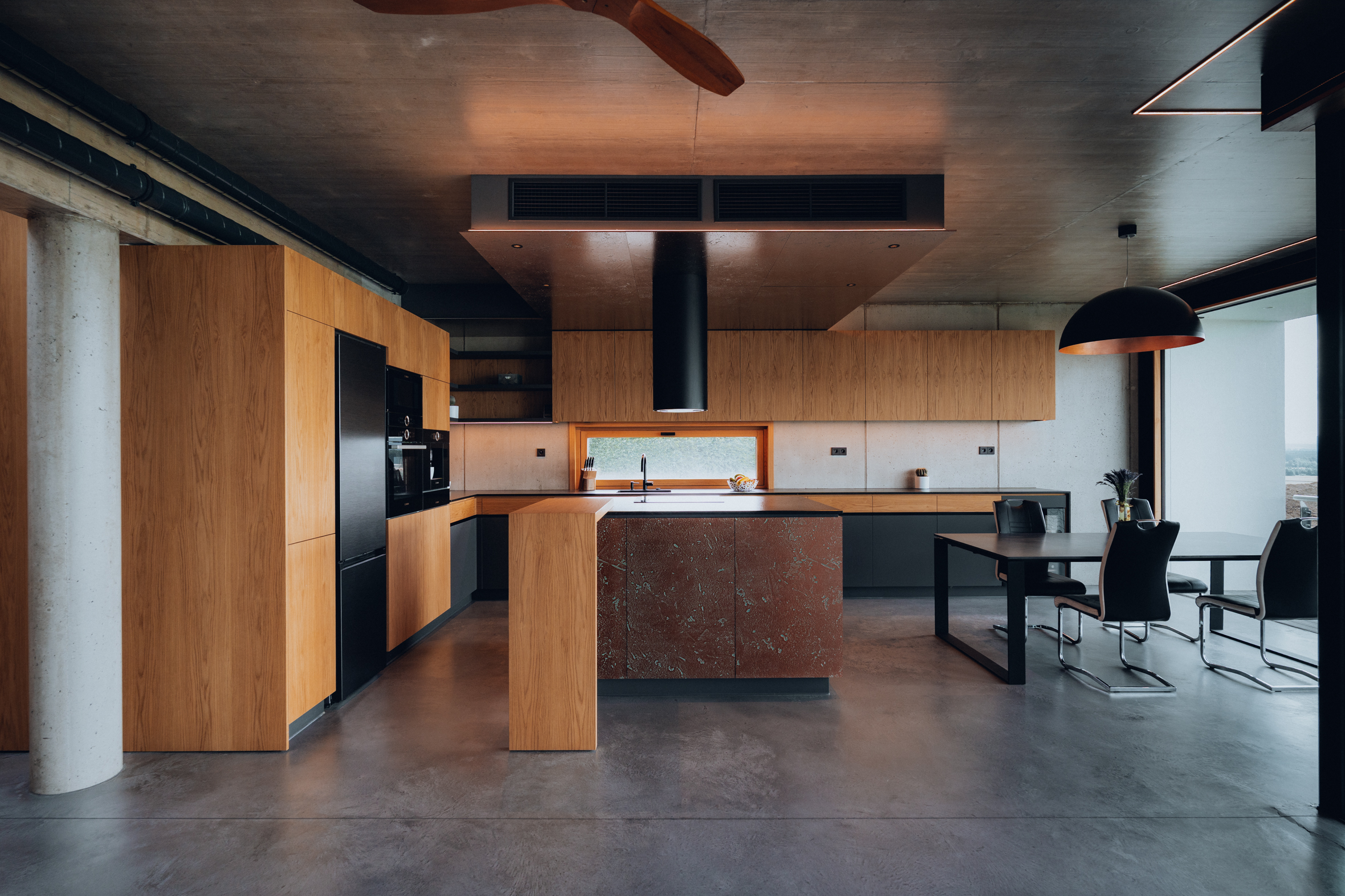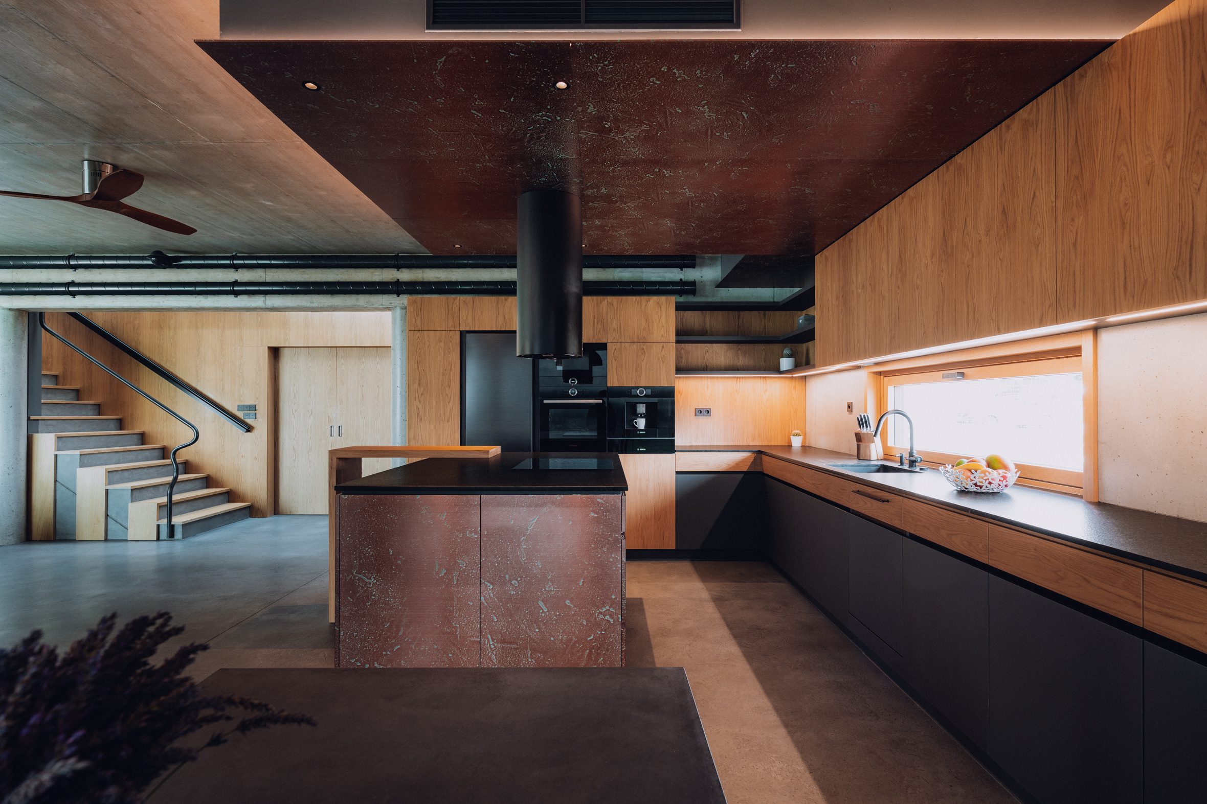 Dominantním prvkem kuchyně je ostrůvek s podhledem z měděného kovolaminátu a pracovní deskou z přírodního kamene Nero Zimbabwe od firmy Bruno Paul. Tento materiál svým charakterem doplňuje prostor nejen esteticky, ale i funkčně.