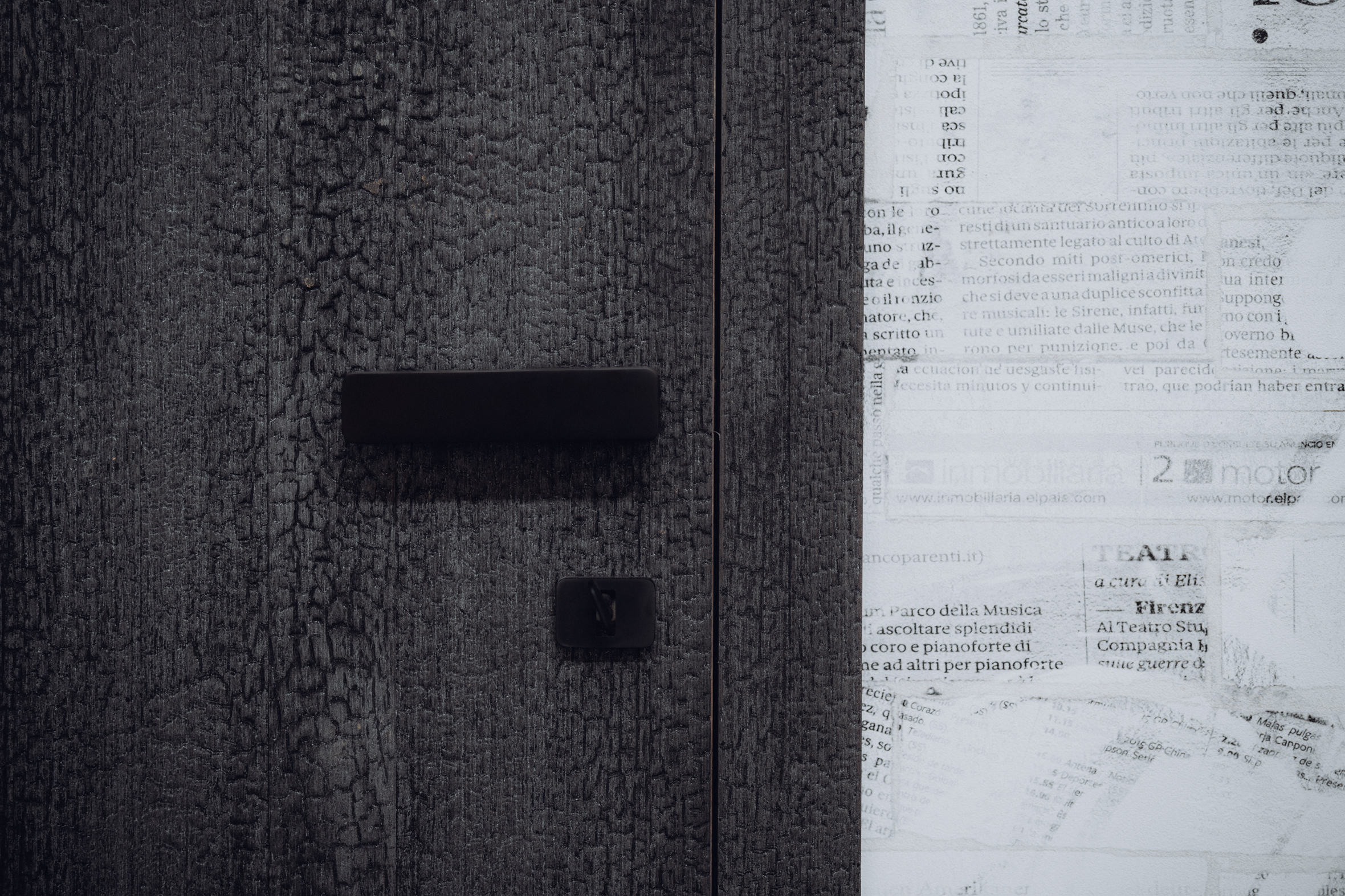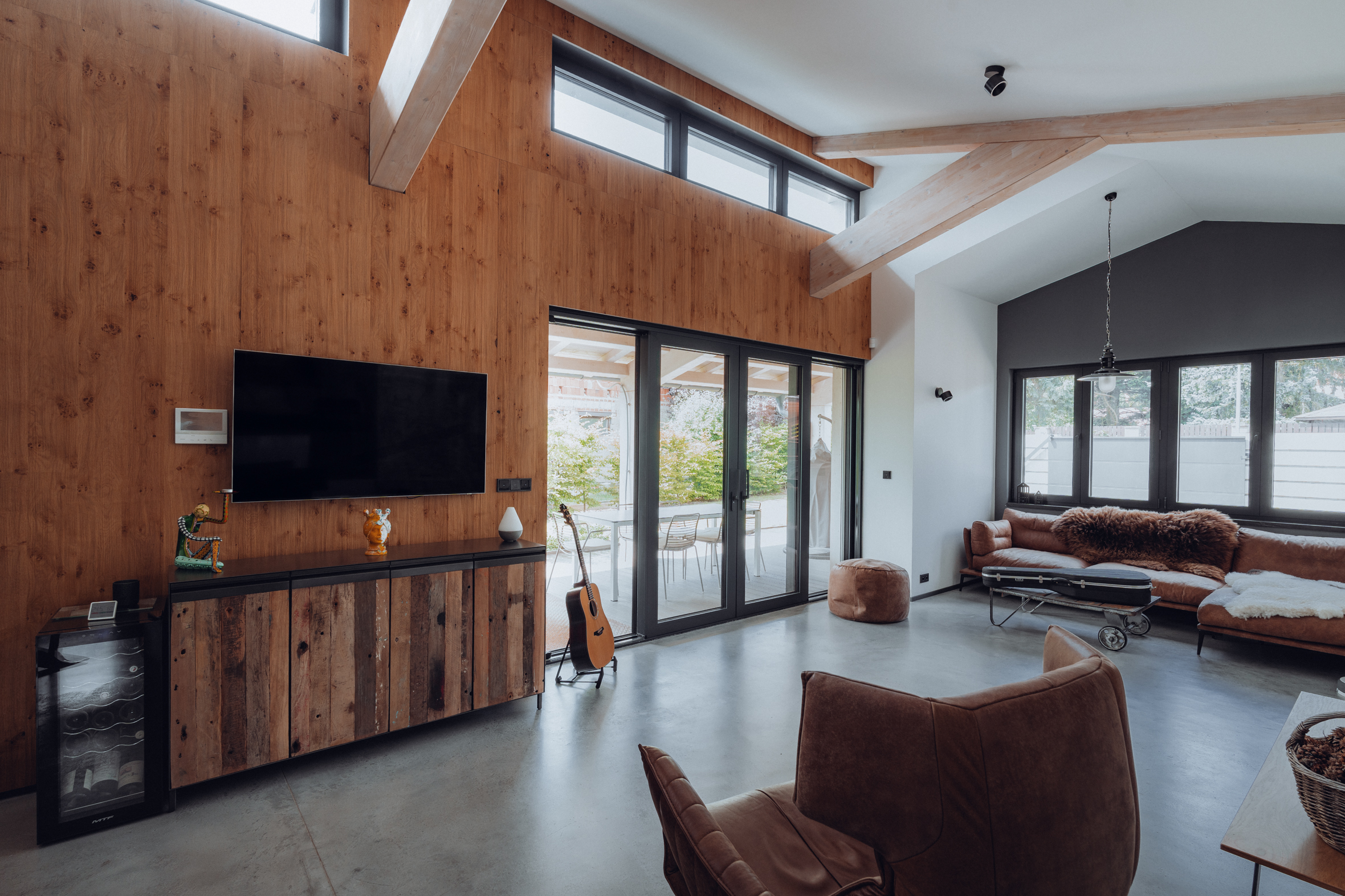 • velkoplošný obklad hlavní obývací stěny se skrytými dveřmi – dominantní prvek obytného prostoru,