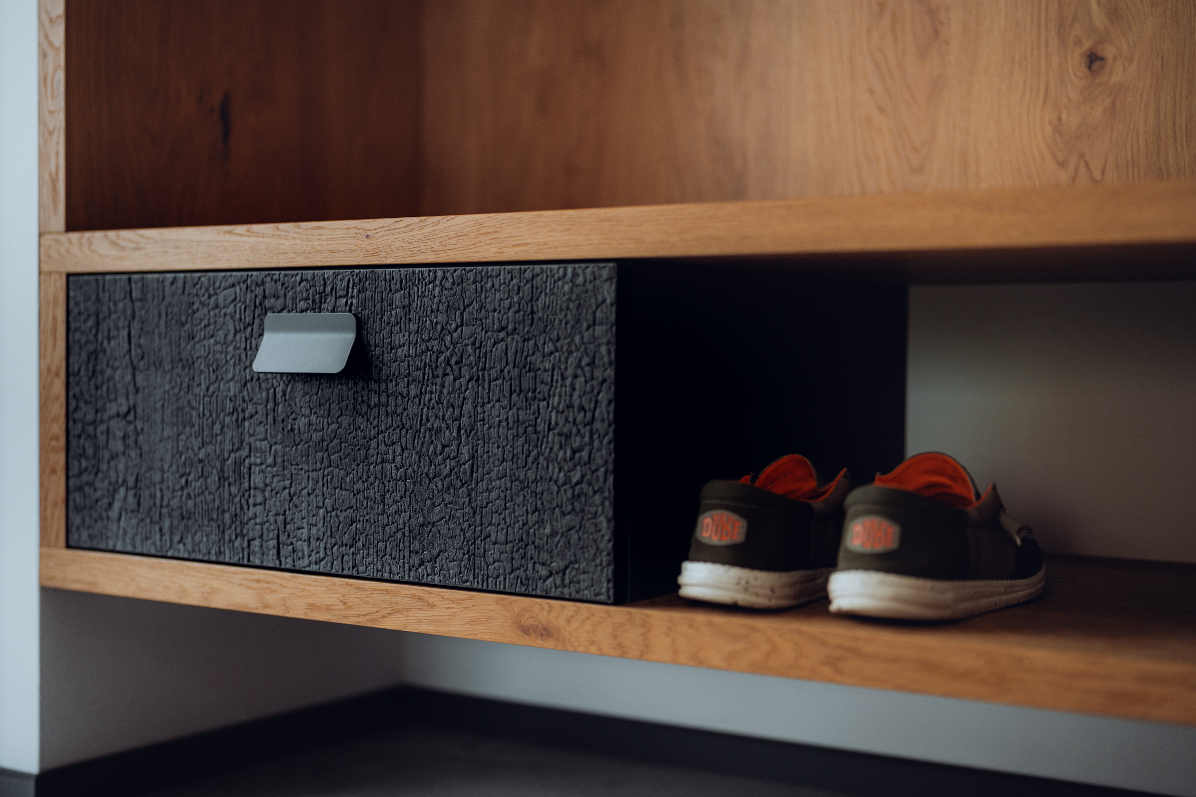 Při realizaci jsme využili materiály Holz in Form, supermatné povrchy Fenix a kovové konstrukce. Díky jejich kombinaci vznikl vyvážený celek s dlouhou životností a vysokou užitnou hodnotou.